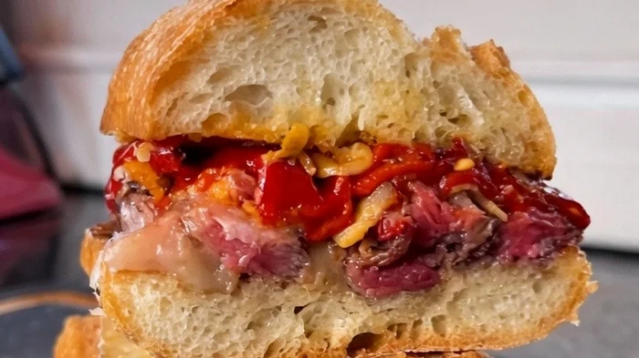 - Læg entrecoten ud, tilsæt piquillo-peberfrugter, lidt hvidløg og et skvæt olivenolie. Resultatet er en sandwich med en sprød skorpe, en mør konsistens indeni og en fyldig smag.